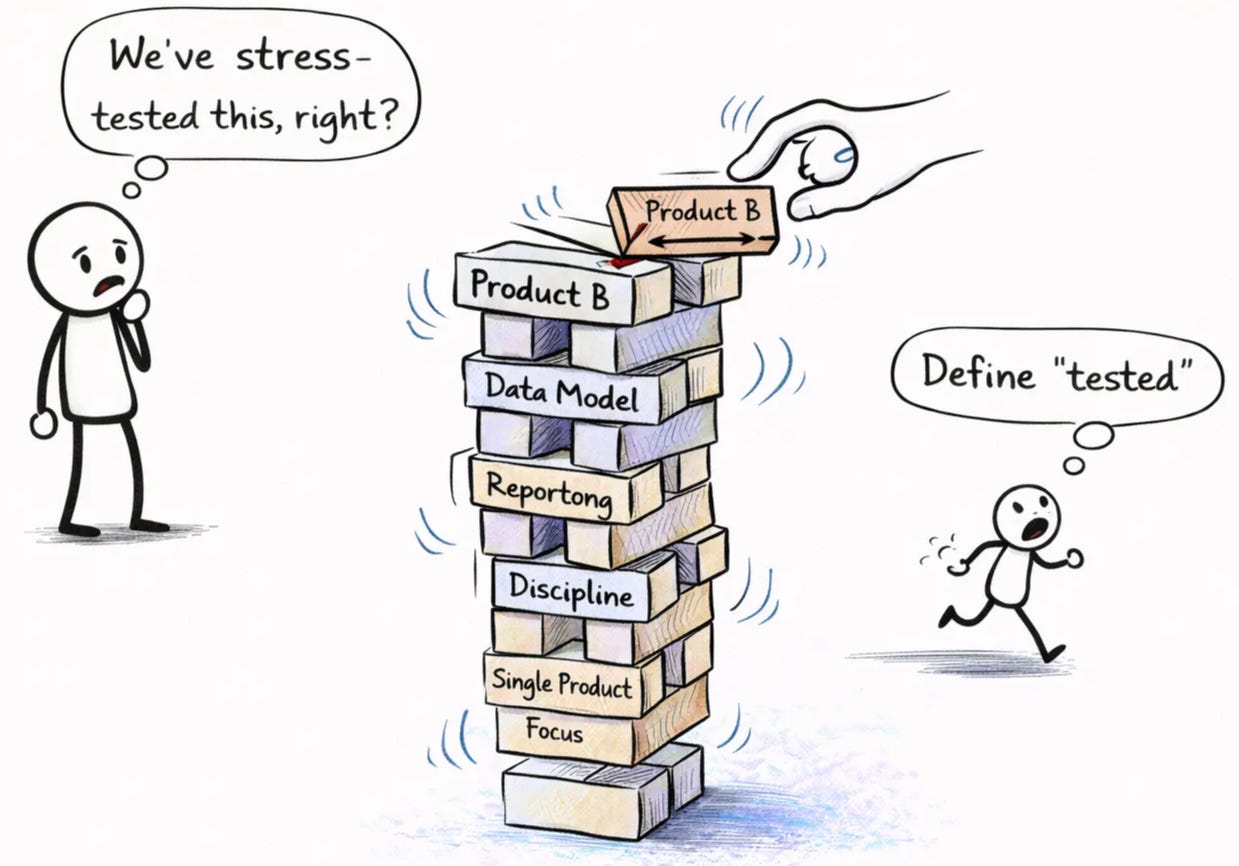 In my experience, the failure isn’t the product. It’s the complexity it reveals. They struggle because the second product exposed assumptions about data, reporting, and underwriting discipline that were never stress-tested at scale. The infrastructure that looked solid at one product was actually optimized for one product. And optimization, it turns out, is a form of brittleness.