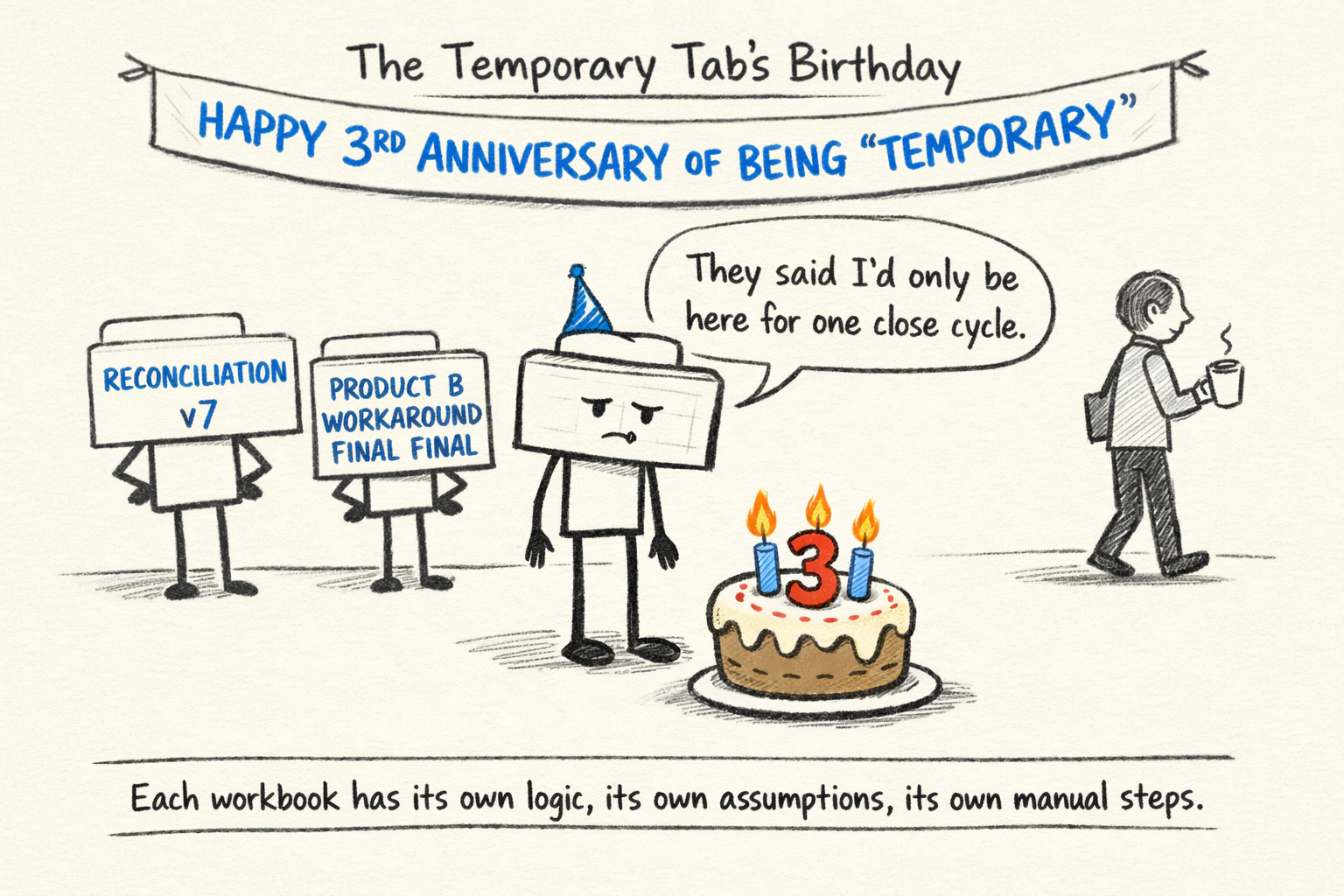 Finance responds the way finance teams always respond: they build a second workbook. Then they build a reconciliation workbook to tie the two together. Then they build a summary workbook that pulls from both reconciliation workbooks to produce management reporting. Each workbook has its own logic, its own assumptions, its own manual steps.