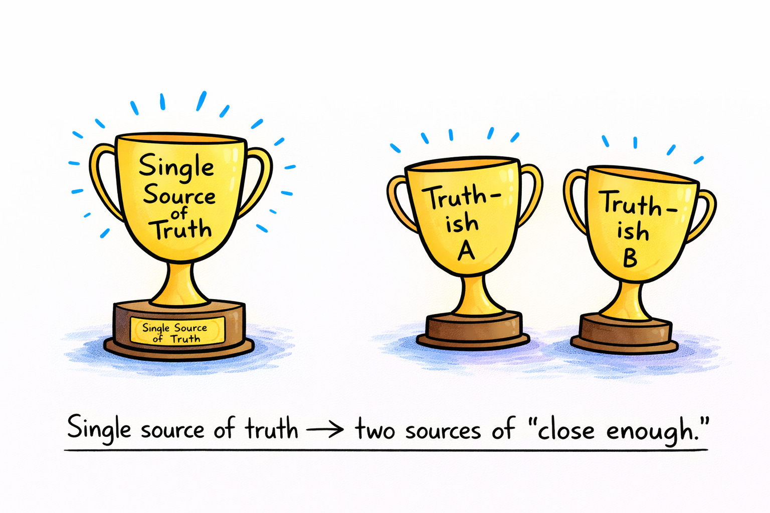 Schema drift. The data model that worked for Product A doesn’t cleanly accommodate Product B. Fields get repurposed. New fields get added inconsistently. The “single source of truth” quietly becomes two sources that don’t quite match. No one notices because both sources are technically correct; both can look internally consistent, until you try to compare them.