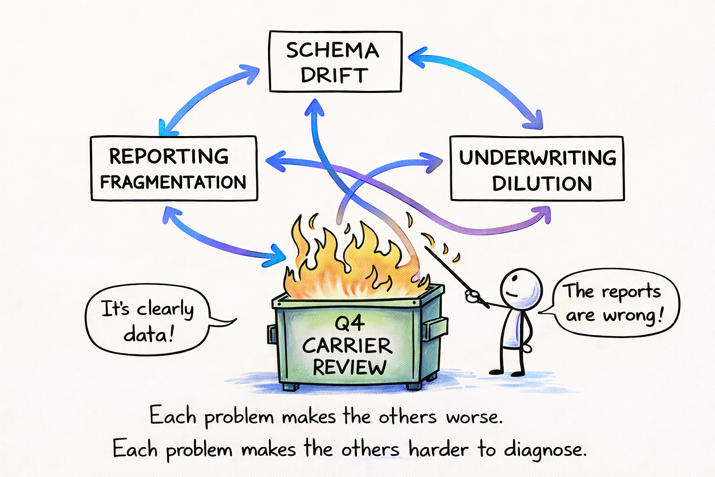 These three failure modes don’t stay separate. Schema drift makes reporting harder. Reporting fragmentation obscures underwriting drift. By the time anyone sees the full picture, the problems have been compounding for two or three quarters. The fix isn’t obvious because the cause isn’t obvious. It looks like a reporting problem. Or a data problem. Or a people problem. It’s actually a systems problem wearing three different masks.