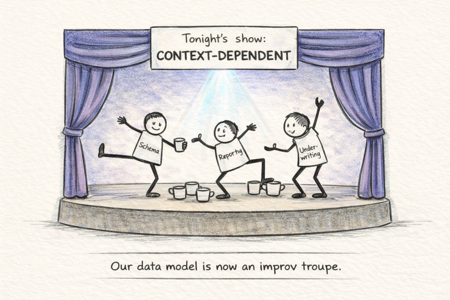 Six months later, the person who made that decision may not be the person maintaining the system. The repurposed field now means different things depending on which product you’re looking at. Downstream reports pull from fields that have become semantically ambiguous. Aggregations (total insured value, premium by class, exposure counts) become unreliable without manual intervention.