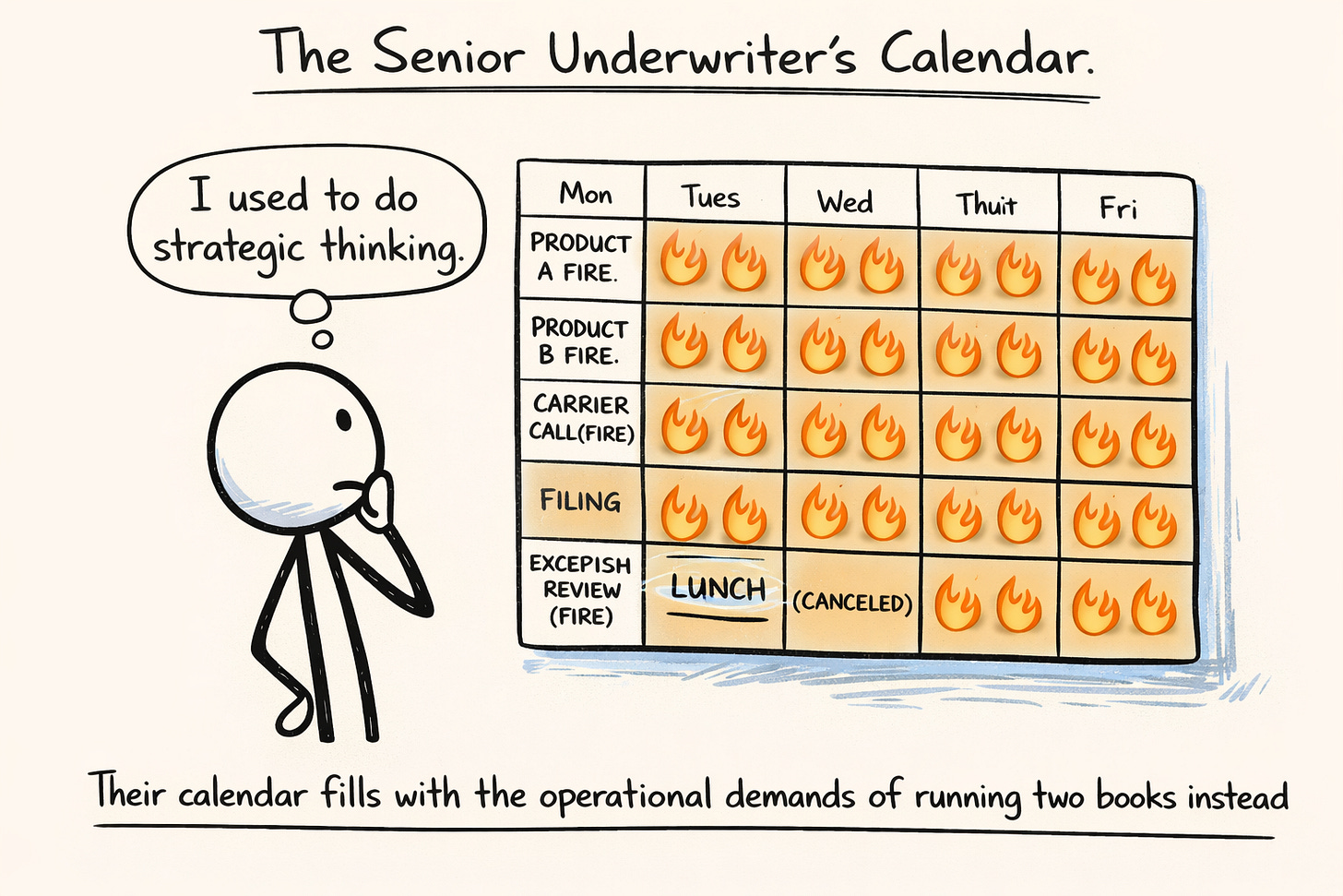When the second product launches, the senior underwriter who owned Product A now oversees both. Their attention splits. They’re in more meetings, reviewing more submissions, answering more questions from more people about more things. Their calendar fills with the operational demands of running two books instead of one. The strategic thinking that characterized the first product’s growth phase gets crowded out by tactical firefighting.