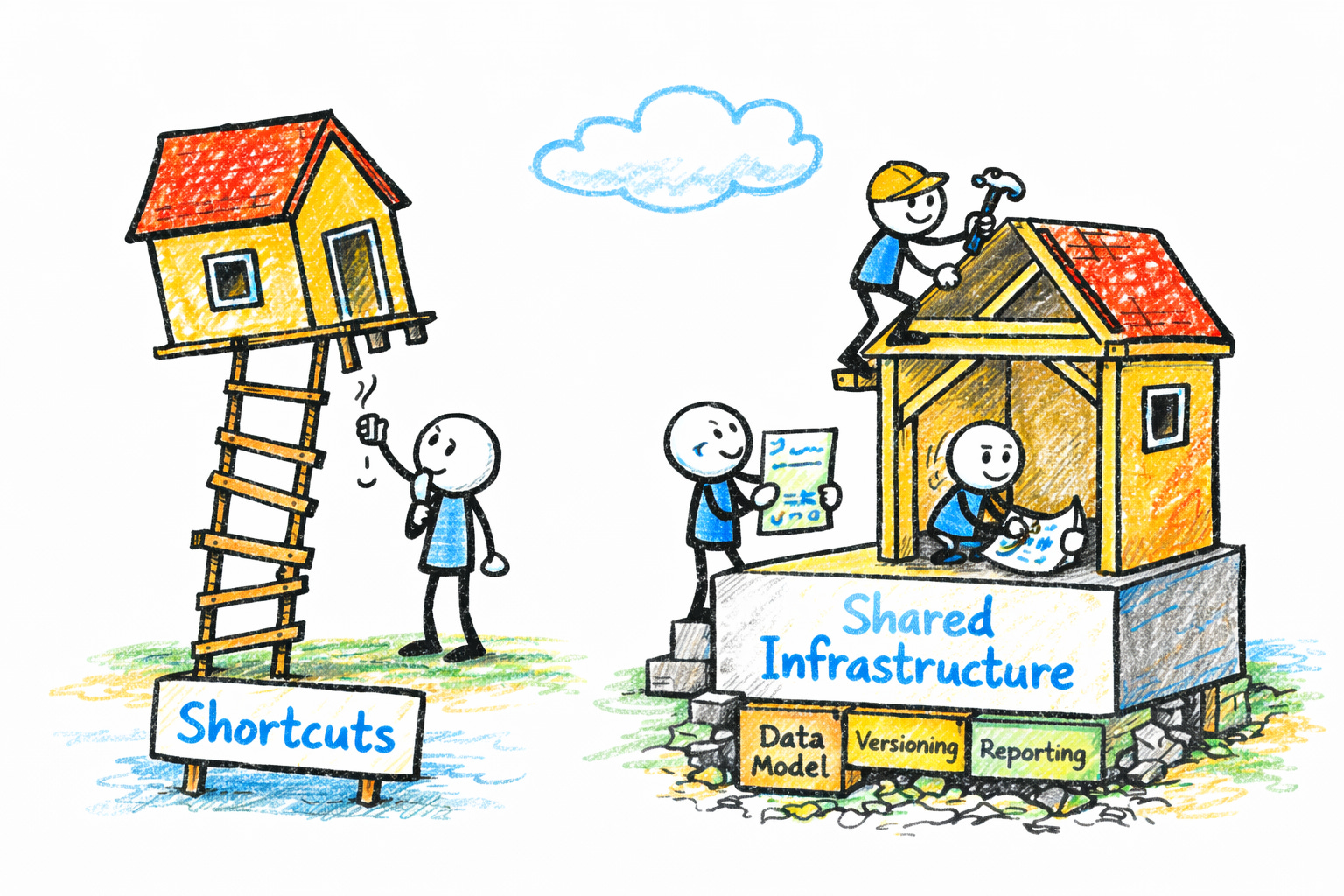 Faced with these differences, teams make a reasonable choice: rather than redesign the schema (which would mean touching every report, every integration, every downstream process) they adapt. An existing field gets repurposed. A new field gets added “just for Product B.” Documentation is thin because the person making the decision is trying to ship, not architect. They’re solving today’s problem, not anticipating next year’s audit.