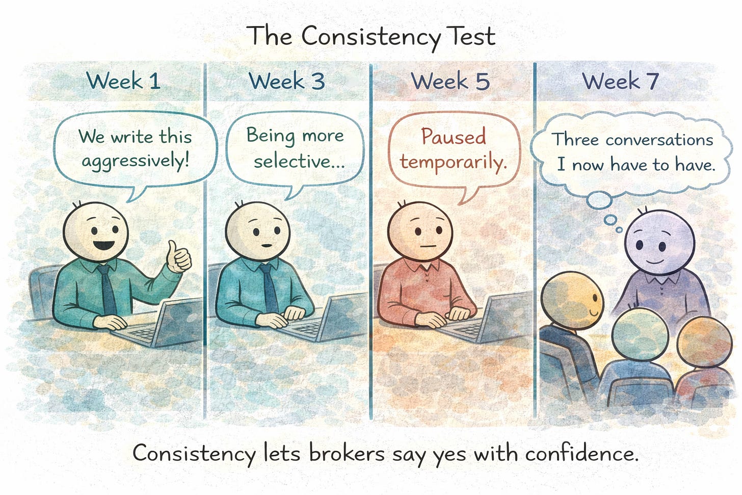 You rebuild by: Fixing the operational issues that caused the surprises—visibly. Over-communicating for a sustained period—appetite changes announced weeks early, not days. Taking responsibility for past friction without being asked. Giving brokers a reason to test you again with low-stakes placements. And then not screwing those up.